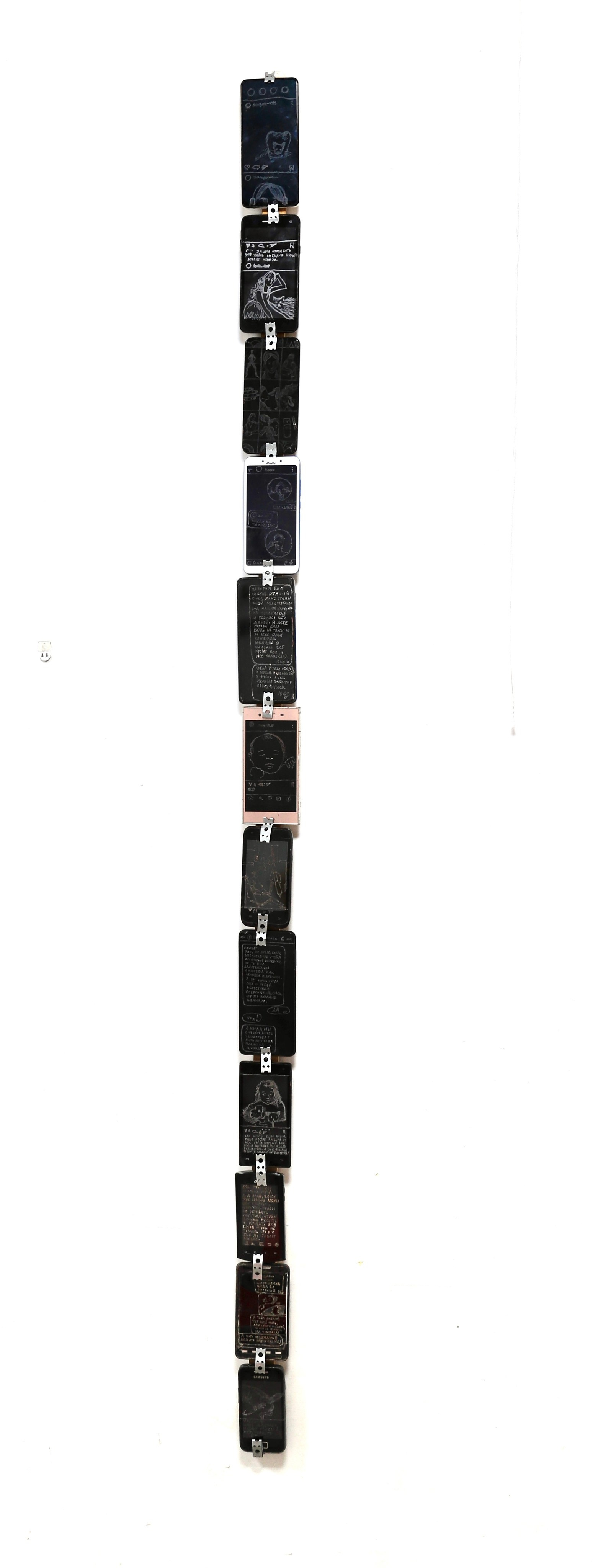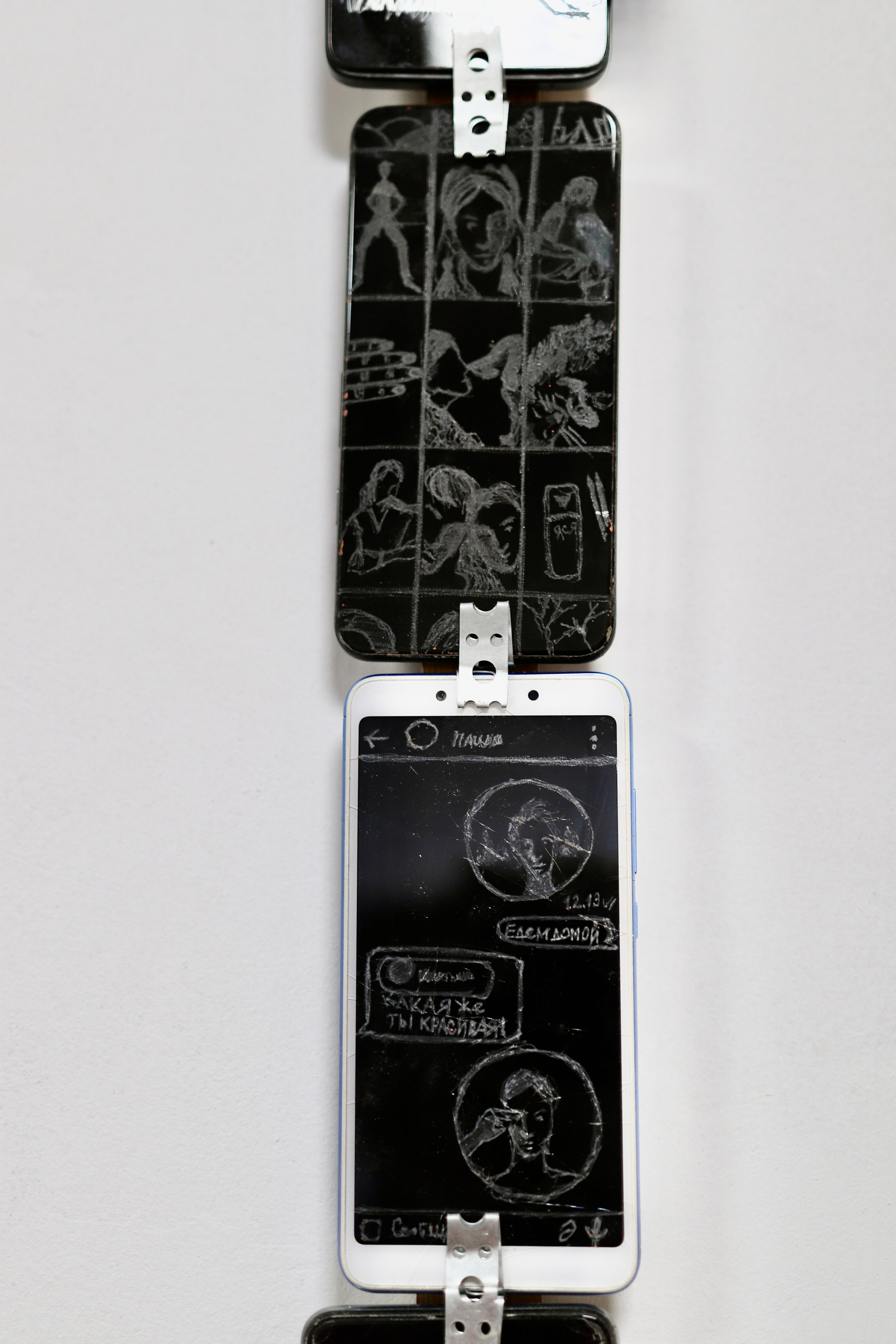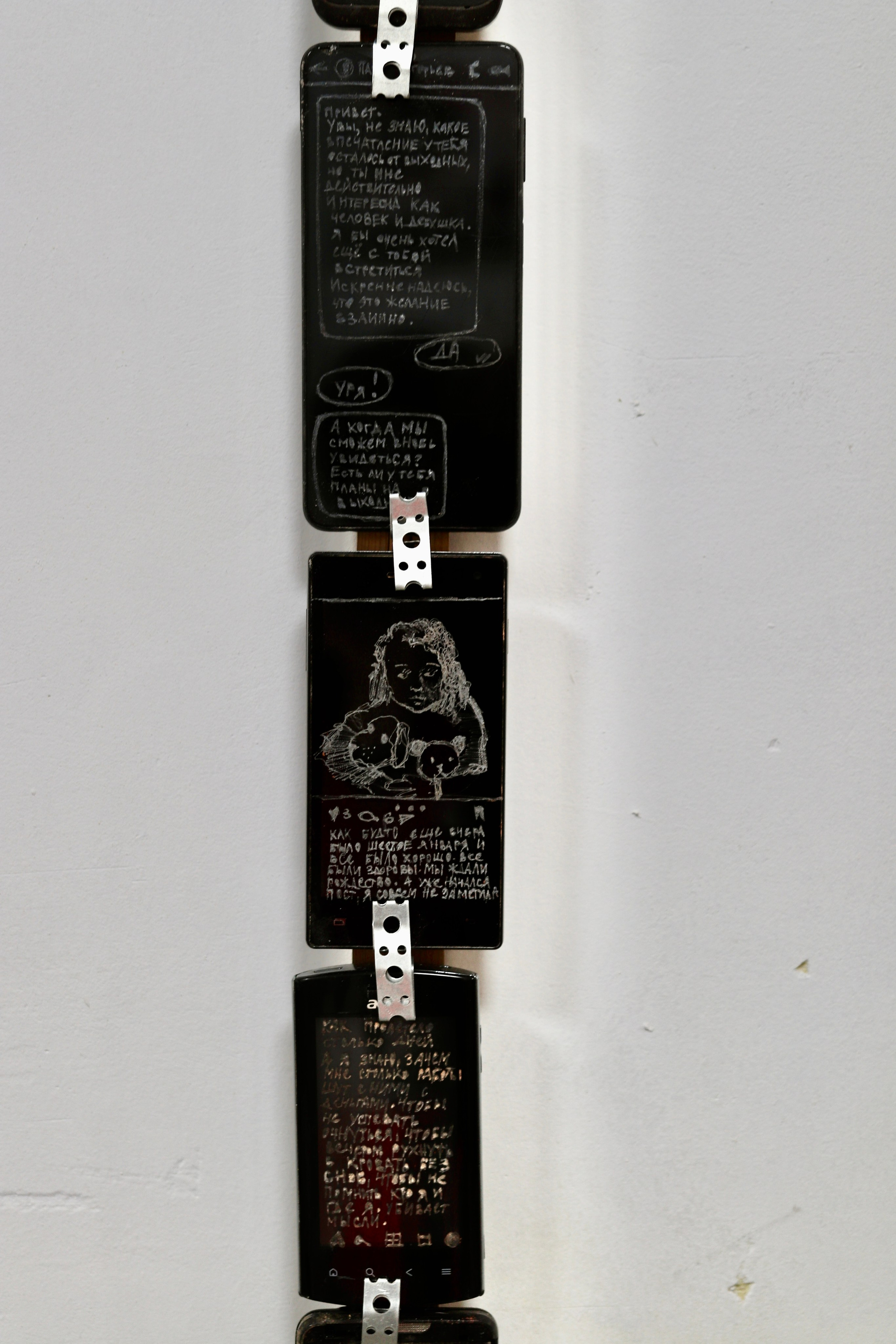 Я создаю ироничный технократичный пантеон смартфонов различных моделей. Ценная информация наносится на них архаичным способом — процарапывается гвоздем на экране. Я использую этот метод для обеспечения долговечности и сохранения данных на случай, если современные технологии безнадежно устареют. Таким образом, нерабочий смартфон превращается из бесполезного куска пластика в реальный носитель ценной информации.